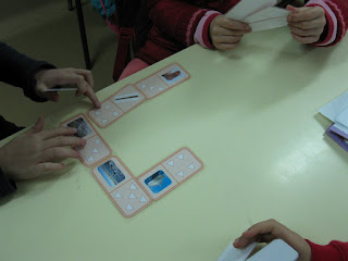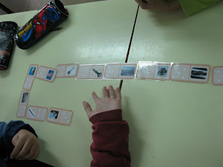 Cortámos palavras em sílabas e descobrimos os sons. Fomos até ao LABORATÓRIO DA LÍNGUA e fizemos uma FICHA DE EXPERIÊNCIA, tudo para ensinar o robô a falar. Por fim, jogámos o dominó dos sons.